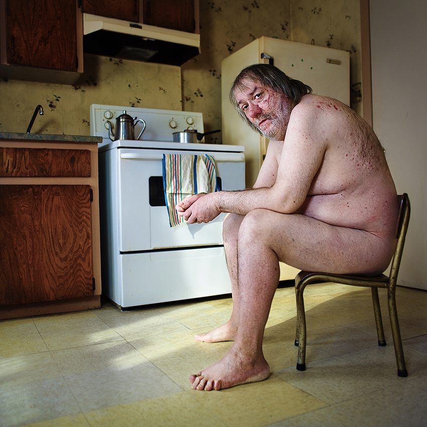 The two have nothing of the pose and polish of the discus throwers inspired by the examples of the ancient Greek and Roman statues. We see five burly guys having fun in a bathroom and on the other photo a sad man in his kitchen, whose raw nakedness seems to symbolize the nakedness of his being after the death of his mother, with whom he lived in his apartment. Bereft and all alone.