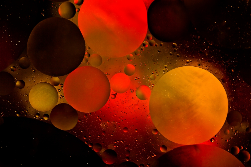 I chose a black cotton scarf with small red and yellow flowers to create the colors of the universe. The black background was an important choice. I wanted to create the drama of dark, infinite space, and I hoped the colors in the flowers would resemble the planets with similar bright hues. I placed the scarf on the floor, directly under the elevated dish. The dish was then filled up halfway with water, and olive oil was poured in, little by little, to get the right combination. I wanted to get both large and small shapes for an interesting composition, and I was able to produce many different sizes of oil circles by swirling the mixture with my finger. My setup was in the kitchen using indirect afternoon light from a skylight and two windows. Using a 100-watt incandescent bulb in a simple hardware store reflector, I directed the light onto the scarf. Bending directly over the floating orbs, I focused the camera by slightly moving it up and down. I took a dozen test shots in Manual mode at ISO 100 to keep noise to a minimum. The apertures I used ranged between f/2.8 to f/7.1. I used manual focus for control. It appeared that the last shot, although a test and a bit dark, had exactly the composition and structure I wanted, and no cropping was required.My goal was to transport the viewer into the deepest regions of the universe using vivid colors, otherworldly forms and extreme lights and darks, imparting the feeling of endless space with seemingly astronomical proportions.