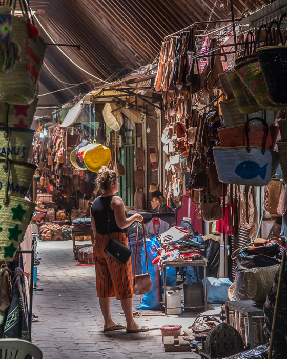 The souks themselves are helpfully divided into product groups such as bags, shoes and other leatherware; copper and ironmongery; clothing and brightly dyed fabrics; fruit, vegetables and other foods and so on. The streets are narrow and often partially covered with slatted roofs which mean that light levels are low and space is at a premium. In these conditions, I wind my ISO setting up to 800 or 1250 and juggle the best compromise between depth of field and shutter speed, often ending up with 1/10s or slower at f5.6 on my 24 – 120mm trusty ‘walkabout’ lens.