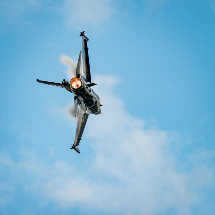 3. Visualisation  of the image has the jet flying past in a turn with the camera pointing into the engine as it moves away. The wings are at an angle of around 30 degrees to the vertical and the top surface of the wings can be seen so that the condensation stands out and the cockpit is visible. In this attitude, it is a compromise between the view of the engine and a sufficient view of the wing surfaces. Opportunities to practice the shot only occur at a couple of airshows during the year so it’s a slow iteration to reach the ideal.