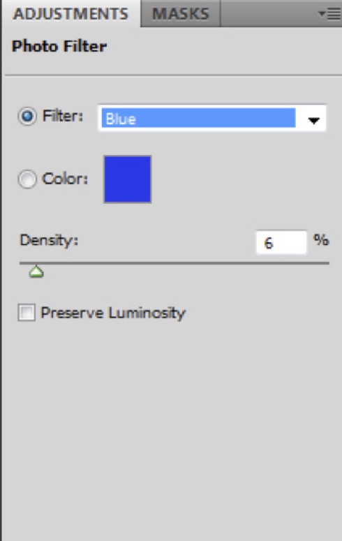 10) Finally, to give the black and white image a very slight blue tone, I applied a Photo Filter adjustment layer and selected Blue from the drop-down menu. Density was set to a very low 6%.